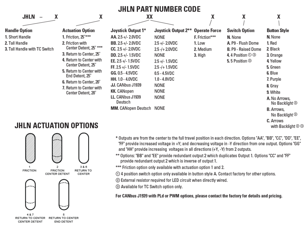 Using contactless Hall effect sensing technology, the JHLN provides precise and reliable control while minimizing wear and extending service life. The joystick can be configured with either friction hold or smooth spring-return-to-center actuation, allowing it to be adapted to different control requirements.